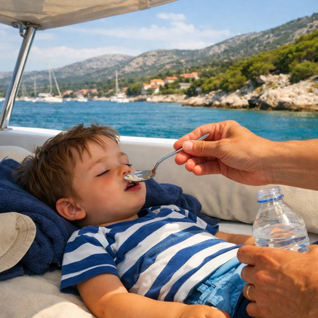 Pomáhá klid v leže, pobyt na palubě ve stínu a podávání vody po lžičkách. Na zklidnění žaludku skvěle fungují suché nesolené sušenky.