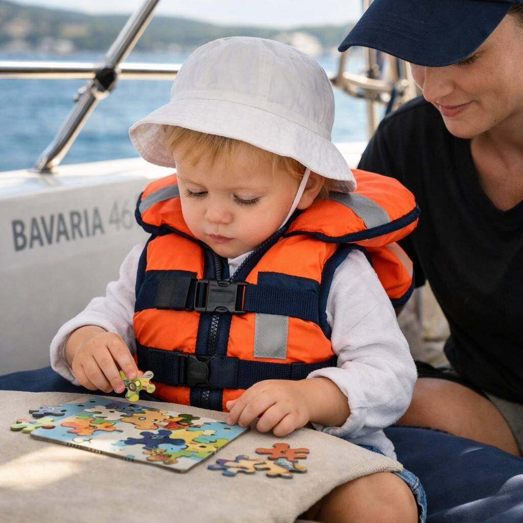 Záchranná vesta je absolutní nutností, jakmile špunt opustí interiér lodě. „Mamí, já tu vestu nechci, škrtí mě!“ Známe to všichni. Pomůže nácvik doma – hrajte si na námořníky už ve vaně nebo na dece v obýváku. A při pohybu po palubě za plavby? Harness (záchytný pás) je váš nejlepší přítel. Připnete dítě jako pejska na vodítko a máte klid.
