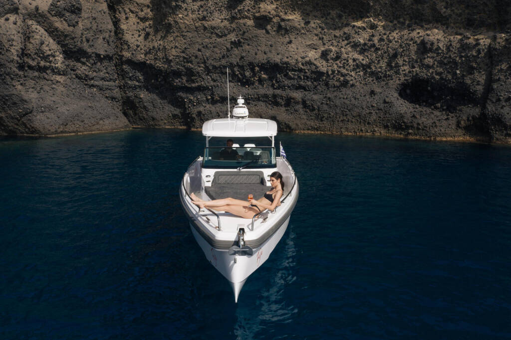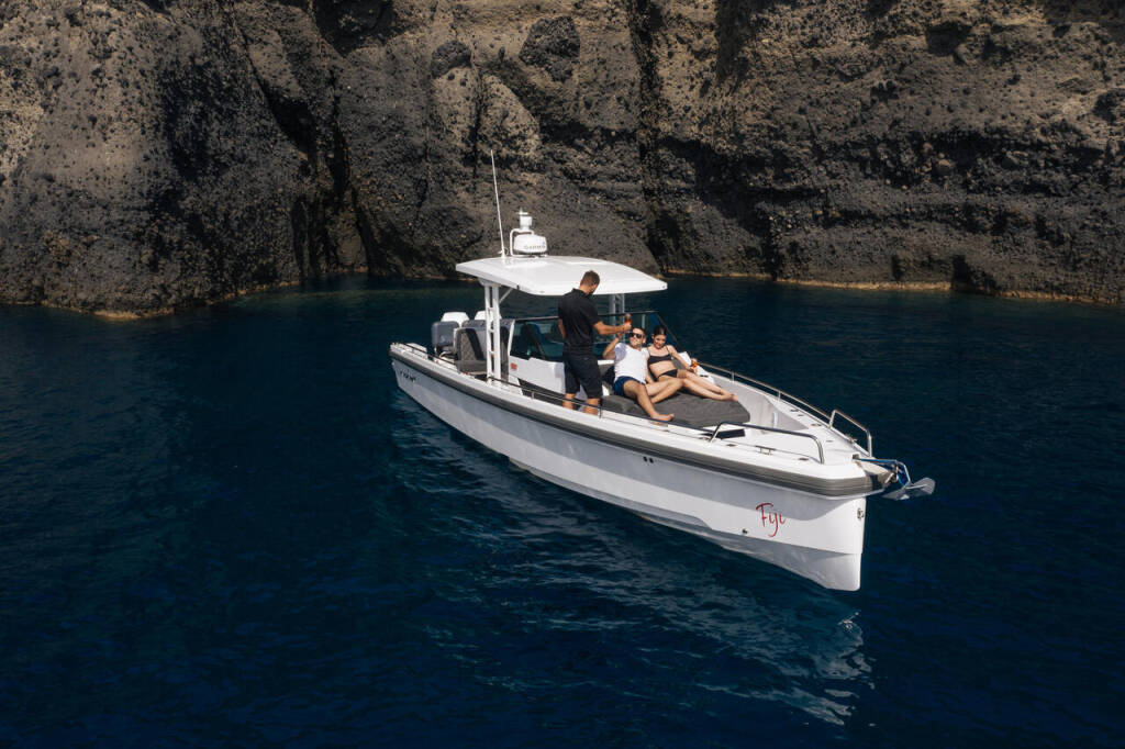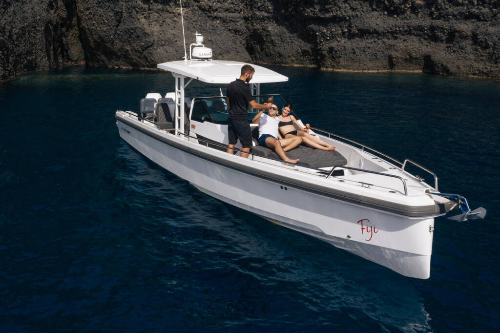 Motorová loď Axopar 37 T-Top Fiji, rok spuštění na vodu 2021 kotví v marině Santorini, Kyklády (Řecko), Řecko. Počet kajut: 1 , může ubytovat celkem: 2 a má toalet: 1 . Povlečení a kuchyňské vybavení jsou zahrnuty v ceně.
