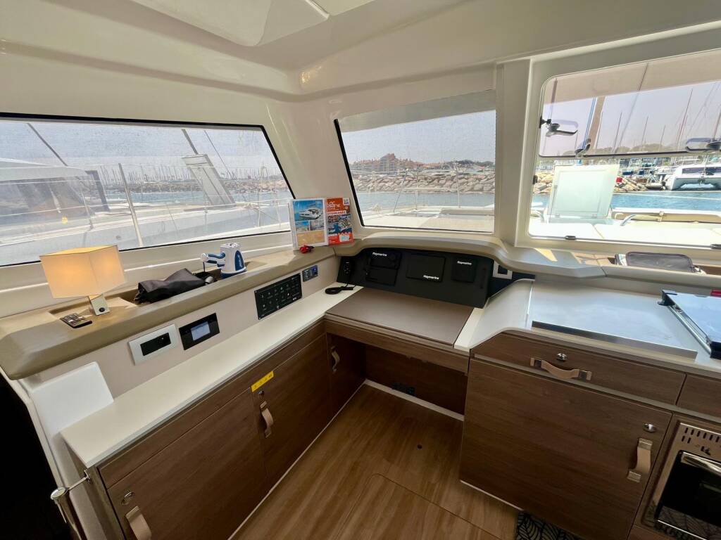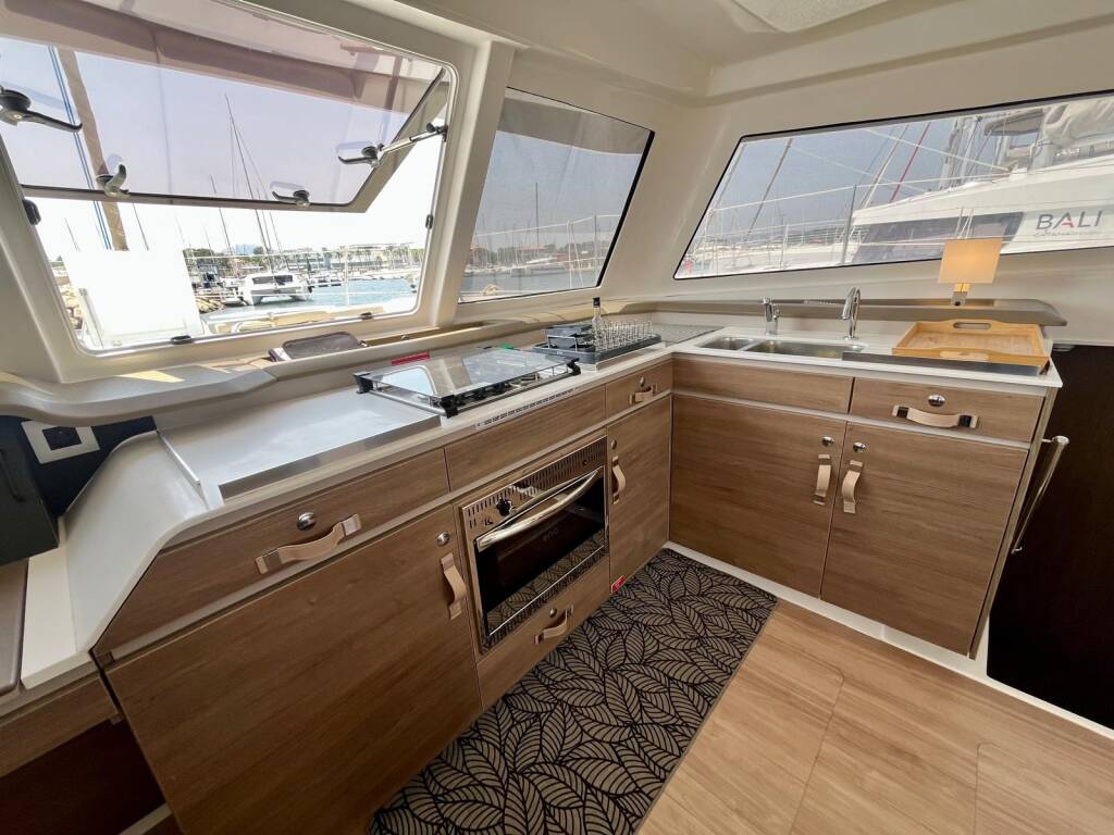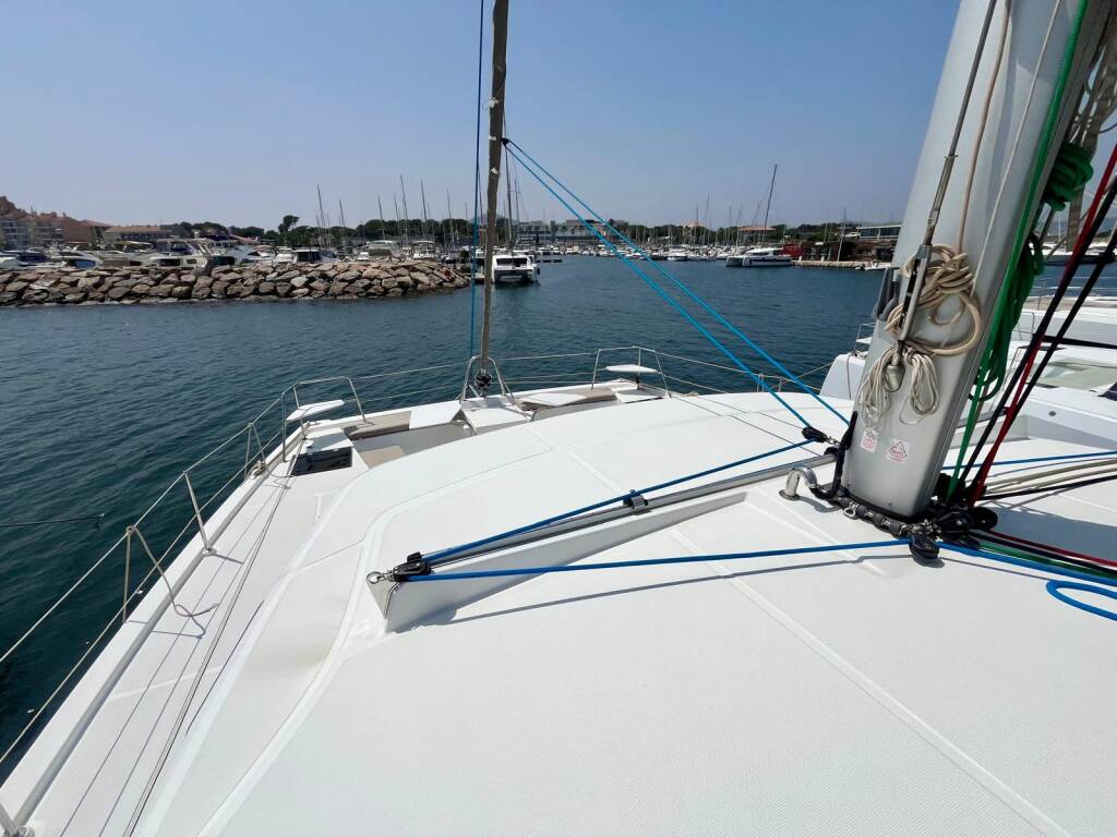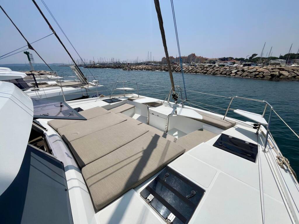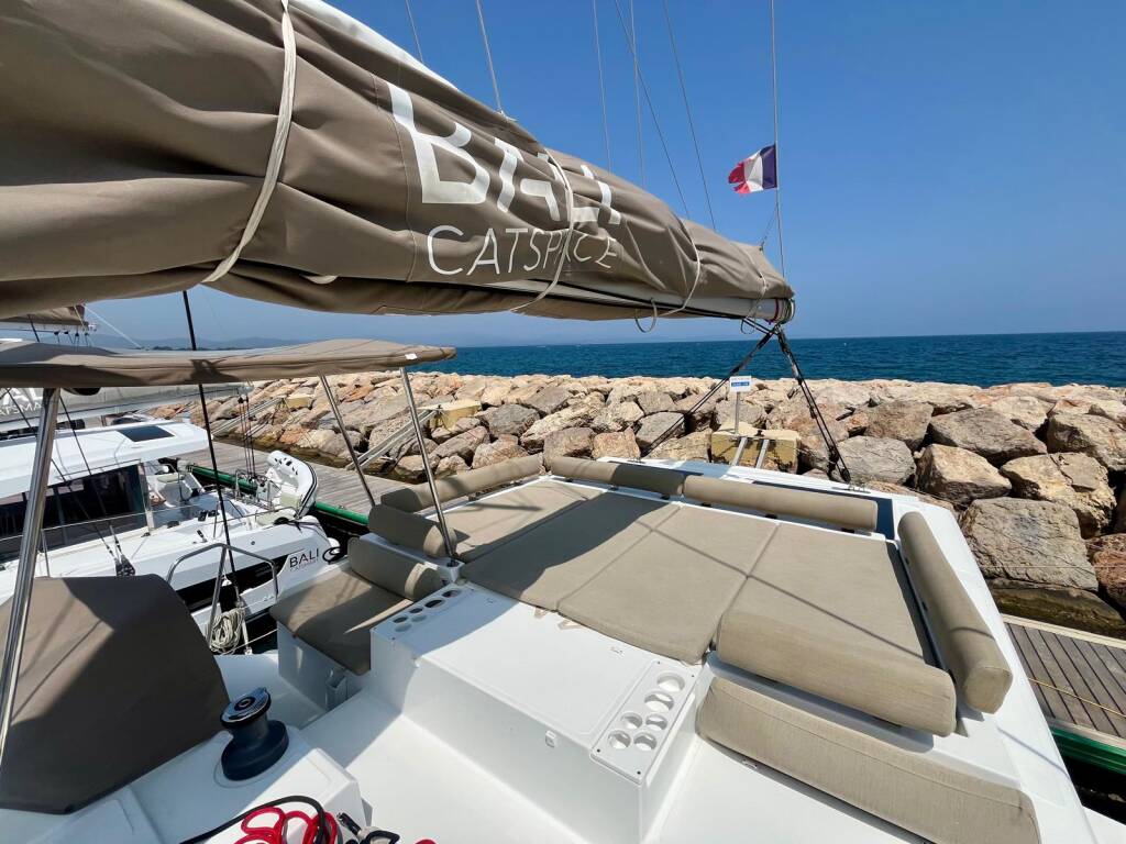 Katamarán Bali Catspace OW Les Evadees, rok spuštění na vodu 2023 kotví v marině Hyeres Port Saint Pierre, Provence-Alpes-Côte d'Azur, Francie. Počet kajut: 3 , může ubytovat celkem: 6 + 2 a má toalet: 3 . Povlečení a kuchyňské vybavení jsou zahrnuty v ceně.