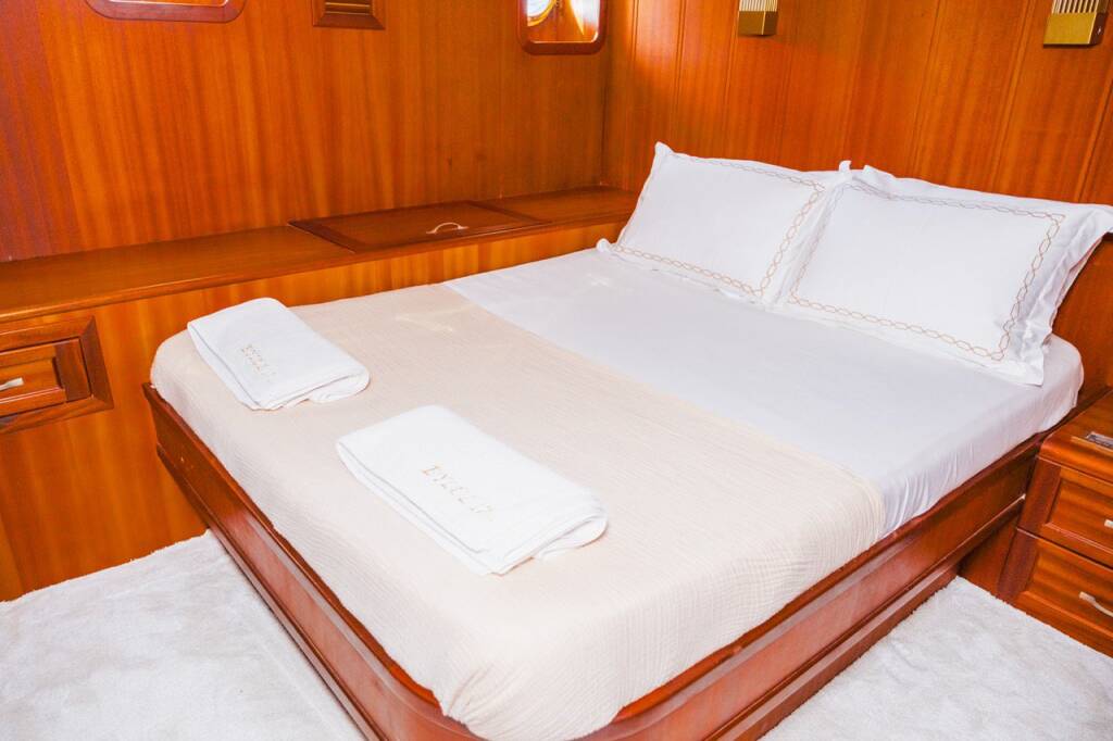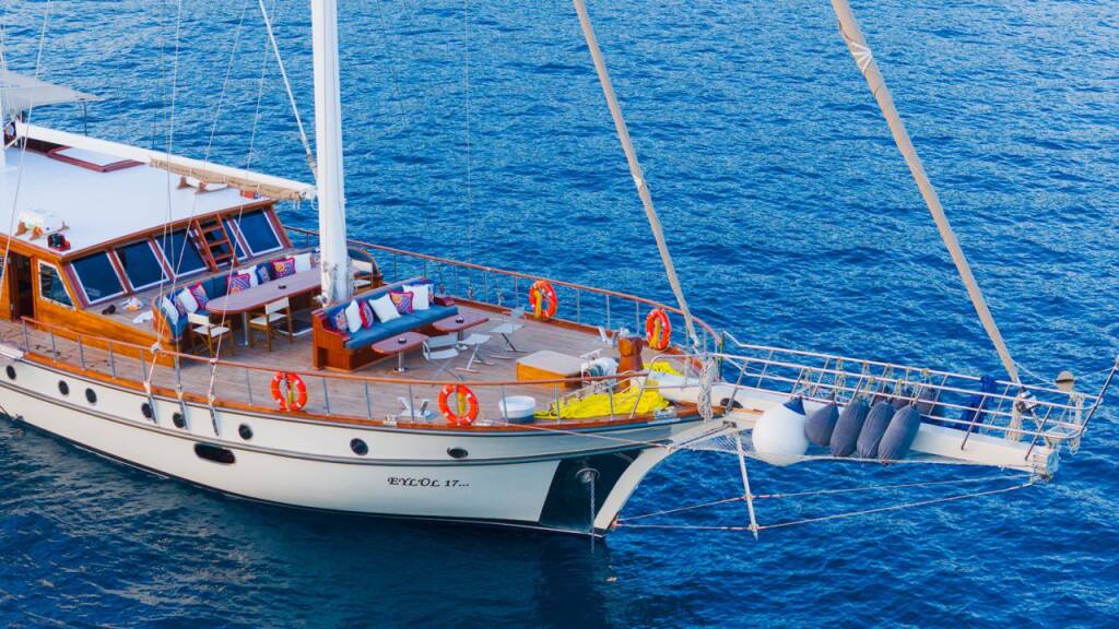 Gulet Eylul Eylul 17, rok spuštění na vodu 2005 kotví v marině Bodrum Harbour, Egejský region (Turecko), Turecko . Počet kajut: 5 + 2 , může ubytovat celkem: 10 + 5 a má toalet: 5 . Povlečení a kuchyňské vybavení jsou zahrnuty v ceně.