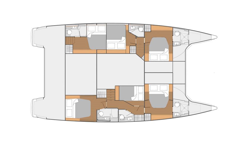 Katamarán Fountaine Pajot Saba 50 Anna Isabella, rok spuštění na vodu 2019 kotví v marině Seychelles, Eden Island Marina, Mahé (Seychely), Seychely . Počet kajut: 5 + 1 , může ubytovat celkem: 10 + 2 a má toalet: 6 . Povlečení a kuchyňské vybavení jsou zahrnuty v ceně.