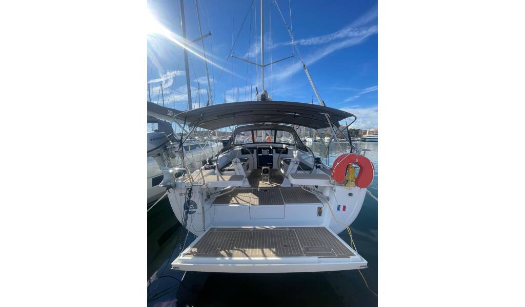 Plachetnice Hanse 388 Odyssee, rok spuštění na vodu 2025 kotví v marině Hyeres Port Saint Pierre, Provence-Alpes-Côte d'Azur, Francie. Počet kajut: 3 , může ubytovat celkem: 6 + 2 a má toalet: 1 . Povlečení a kuchyňské vybavení jsou zahrnuty v ceně.