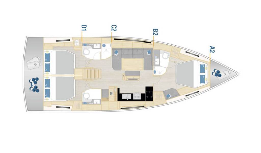 Plachetnice Hanse 460 Felice, rok spuštění na vodu 2024 kotví v marině Trogir, Yachtclub Seget (Marina Baotić), Splitský region (Chorvatsko), Chorvatsko. Počet kajut: 3 , může ubytovat celkem: 6 + 2 a má toalet: 3 . Povlečení a kuchyňské vybavení jsou zahrnuty v ceně.