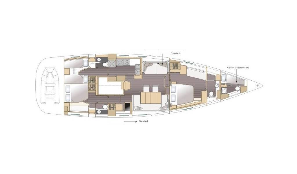 Plachetnice Jeanneau 64 Aria, rok spuštění na vodu 2016 kotví v marině Pula - ACI Marina, Istrie (Chorvatsko), Chorvatsko. Počet kajut: 4 , může ubytovat celkem: 8 + 1 a má toalet: 3 . Povlečení a kuchyňské vybavení jsou zahrnuty v ceně.
