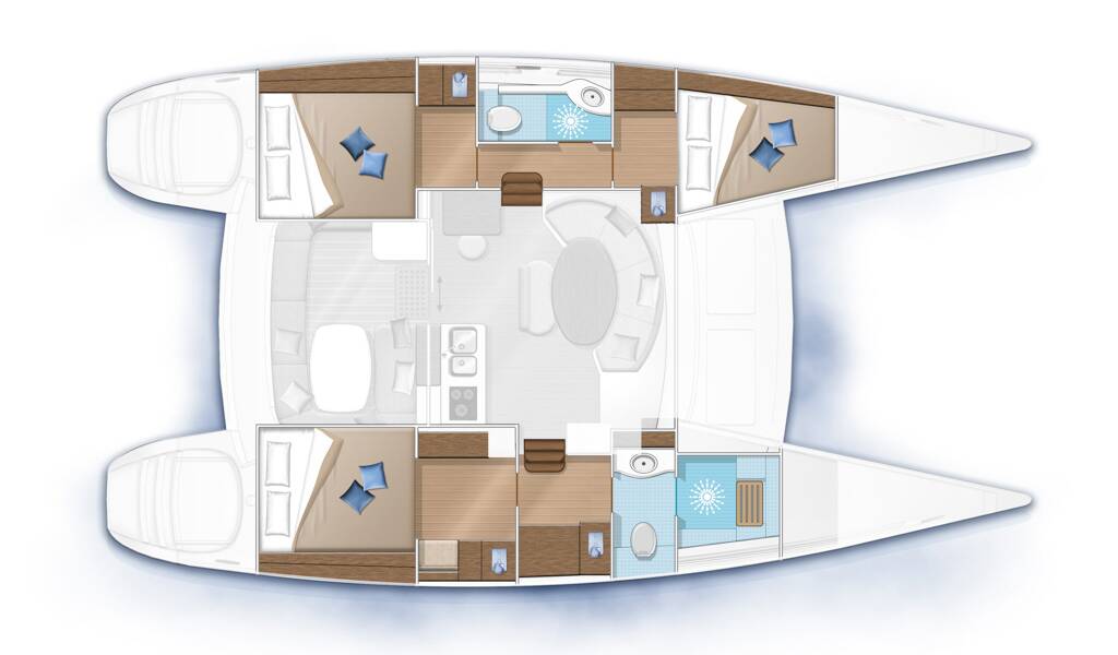 Katamarán Lagoon 380 Saint Blue, rok spuštění na vodu 2019 kotví v marině BVI, Tortola, Ritter House Marina, Britské Panenské Ostrovy (BVI), Britské Panenské ostrovy. Počet kajut: 3 , může ubytovat celkem: 6 + 2 a má toalet: 2 . Povlečení a kuchyňské vybavení jsou zahrnuty v ceně.