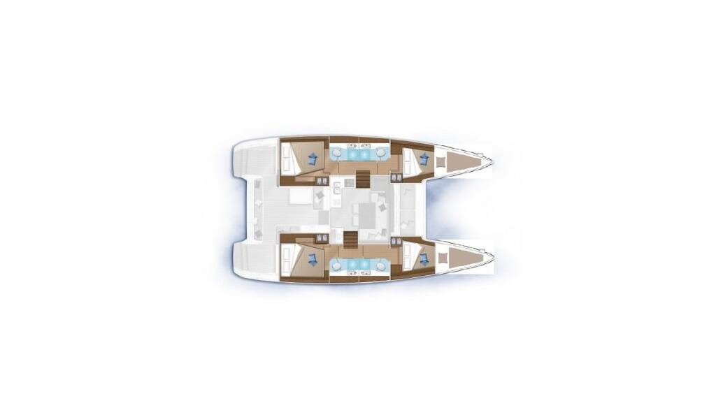 Katamarán Lagoon 40 Blue Eyes, rok spuštění na vodu 2019 kotví v marině ACI Marina Split, Splitský region (Chorvatsko), Chorvatsko. Počet kajut: 4 + 2 , může ubytovat celkem: 8 + 2 + 2 a má toalet: 4 . Povlečení a kuchyňské vybavení jsou zahrnuty v ceně.