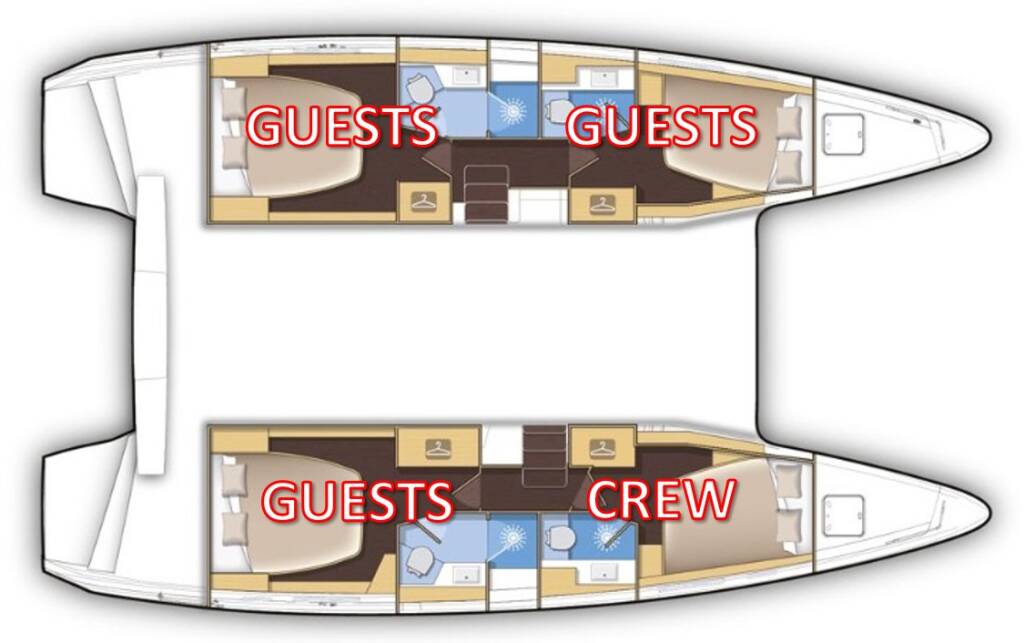Katamarán Lagoon 42 Aura, rok spuštění na vodu 2018 kotví v marině Split - Marina Kaštela, Splitský region (Chorvatsko), Chorvatsko. Počet kajut: 3 + 1 , může ubytovat celkem: 6 + 2 a má toalet: 3 . Povlečení a kuchyňské vybavení jsou zahrnuty v ceně.
