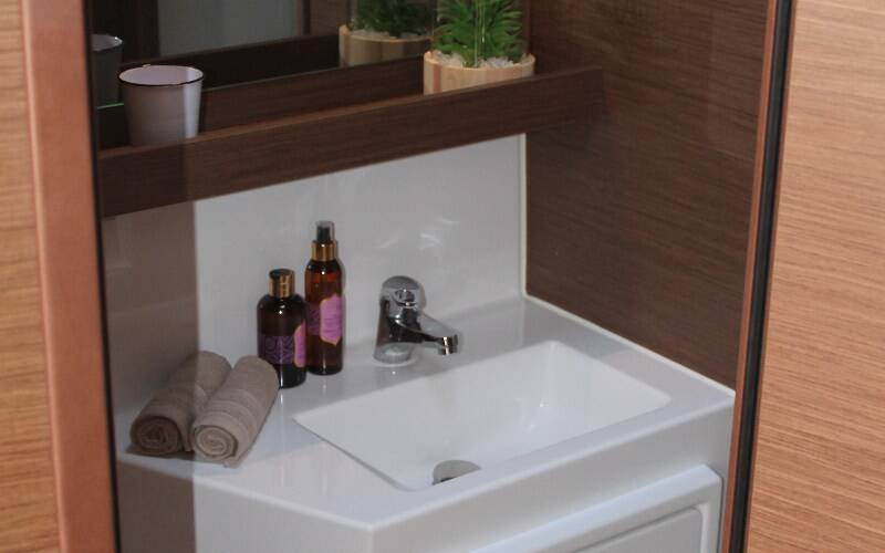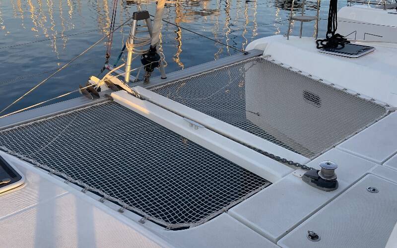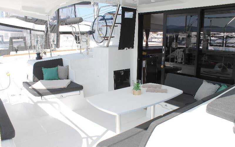Katamarán Lagoon 42 Double Trouble, rok spuštění na vodu 2018 kotví v marině St. Raphael, Provence-Alpes-Côte d'Azur, Francie. Počet kajut: 4 + 2 , může ubytovat celkem: 8 + 2 + 2 a má toalet: 4 . Povlečení a kuchyňské vybavení jsou zahrnuty v ceně.