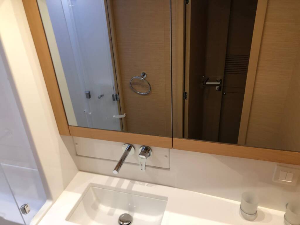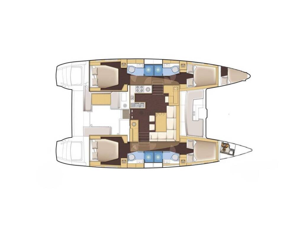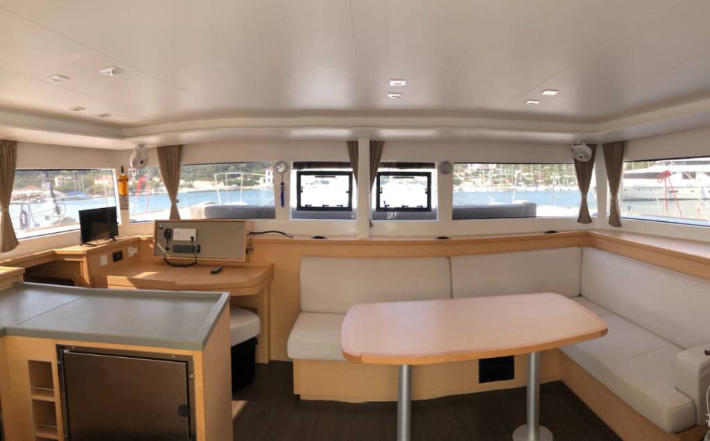 Katamarán Lagoon 450 F Aristofanis, rok spuštění na vodu 2019 kotví v marině Lefkas main port, Jónské ostrovy (Řecko), Řecko. Počet kajut: 4 + 1 , může ubytovat celkem: 8 + 2 + 1 a má toalet: 4 . Povlečení a kuchyňské vybavení jsou zahrnuty v ceně.