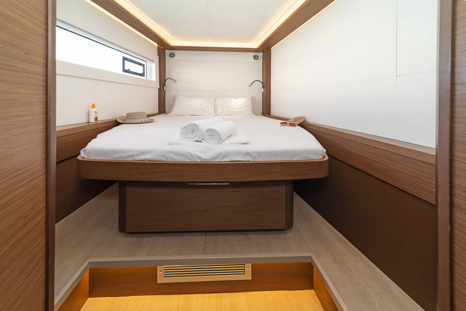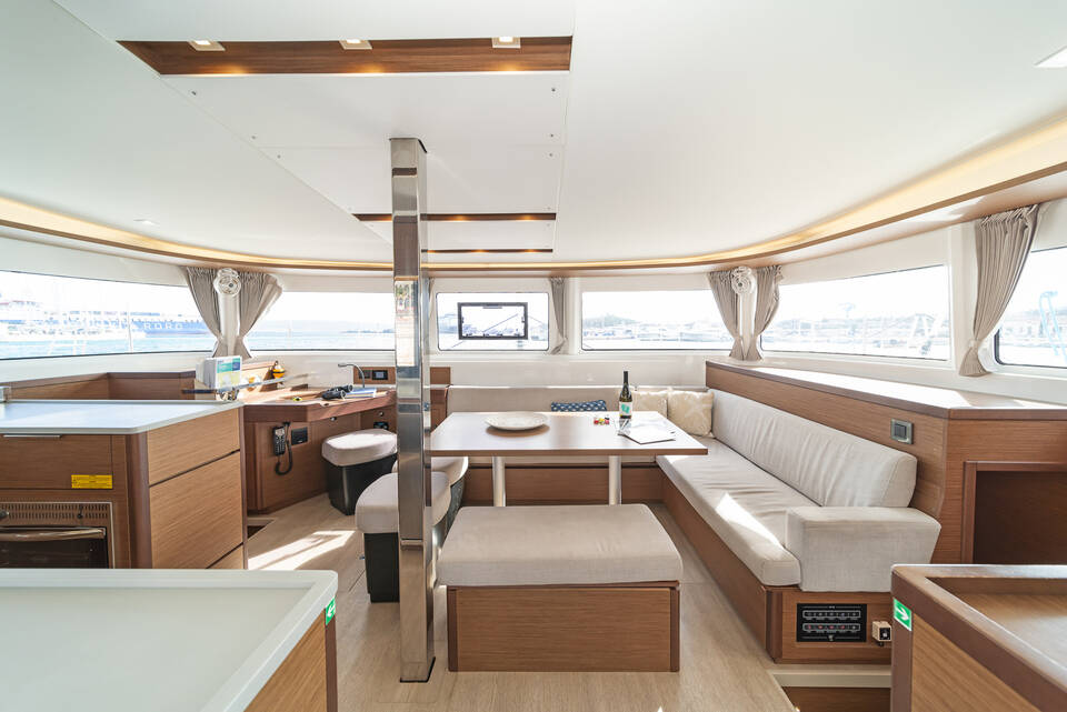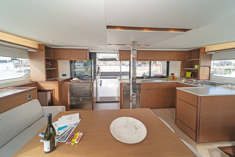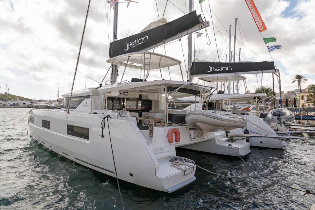Katamarán Lagoon 46 One Thought, rok spuštění na vodu 2024 kotví v marině Lefkas main port, Jónské ostrovy (Řecko), Řecko. Počet kajut: 4 + 2 , může ubytovat celkem: 8 + 2 a má toalet: 4 + 1 . Povlečení a kuchyňské vybavení jsou zahrnuty v ceně.