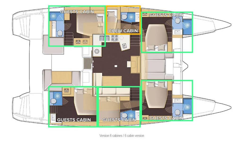 Katamarán Lagoon 52 Serenity, rok spuštění na vodu 2015 kotví v marině Split - Marina Kaštela, Splitský region (Chorvatsko), Chorvatsko. Počet kajut: 5 + 1 , může ubytovat celkem: 10 + 2 a má toalet: 5 + 1 . Povlečení a kuchyňské vybavení jsou zahrnuty v ceně.