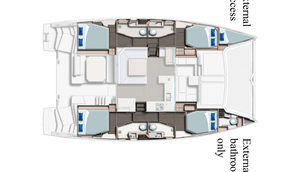 Katamarán Leopard 45 Dou Reve V, rok spuštění na vodu 2022 kotví v marině Sardínia, Cannigione, Sardínie (Itálie), Itálie. Počet kajut: 4 + 1 , může ubytovat celkem: 8 + 2 + 1 a má toalet: 4 + 1 . Povlečení a kuchyňské vybavení jsou zahrnuty v ceně.