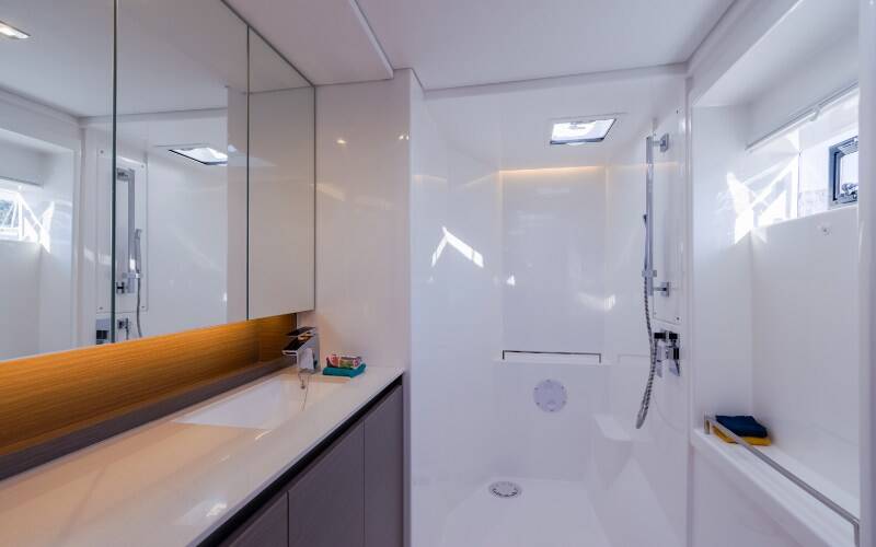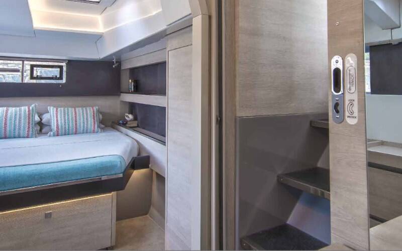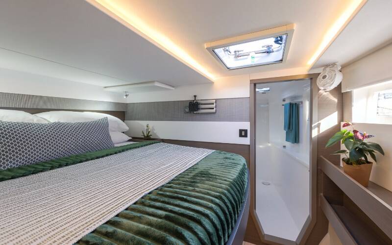 Katamarán Leopard 50 Never Give Up, rok spuštění na vodu 2024 kotví v marině St. Raphael, Provence-Alpes-Côte d'Azur, Francie. Počet kajut: 4 + 1 , může ubytovat celkem: 8 + 2 + 1 a má toalet: 4 . Povlečení a kuchyňské vybavení jsou zahrnuty v ceně.