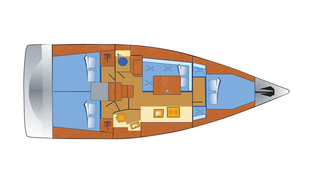 Plachetnice Oceanis 38 Ulysses, rok spuštění na vodu 2014 kotví v marině Heiligenhafen, Schleswig-Holstein (Německo), Německo. Počet kajut: 3 , může ubytovat celkem: 6 a má toalet: 1 . Povlečení a kuchyňské vybavení jsou zahrnuty v ceně.