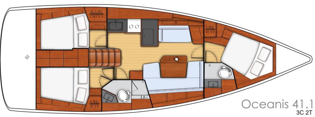Plachetnice Oceanis 41.1 Luxa, rok spuštění na vodu 2019 kotví v marině ACI Marina Split, Splitský region (Chorvatsko), Chorvatsko. Počet kajut: 3 , může ubytovat celkem: 6 + 2 a má toalet: 2 . Povlečení a kuchyňské vybavení jsou zahrnuty v ceně.