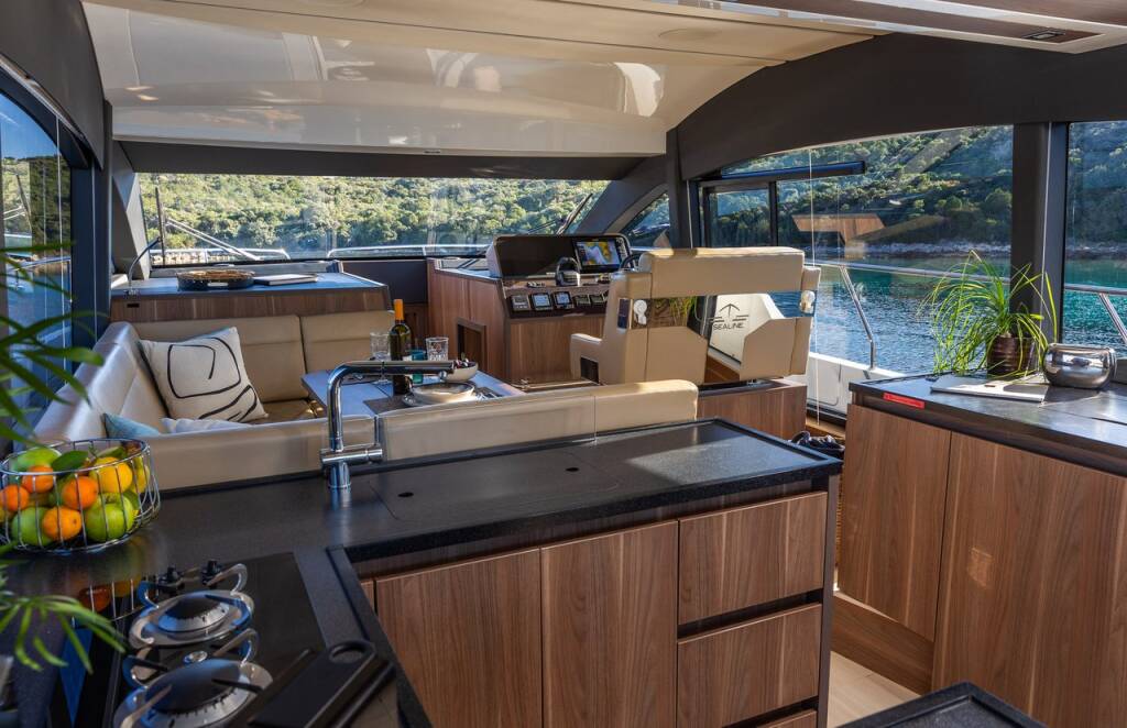 Motorová jachta Sealine F430 Lomar, rok spuštění na vodu 2019 kotví v marině Dubrovnik, Town Port, Dubrovnický region (Chorvatsko), Chorvatsko. Počet kajut: 3 , může ubytovat celkem: 4 + 1 a má toalet: 2 . Povlečení a kuchyňské vybavení jsou zahrnuty v ceně.