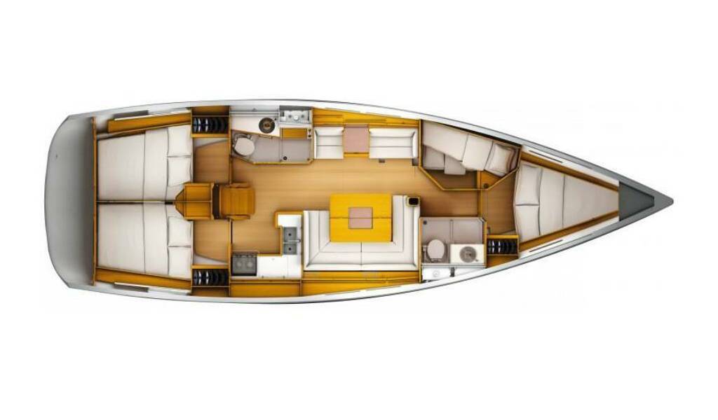 Plachetnice Sun Odyssey 439 Aura, rok spuštění na vodu 2012 kotví v marině ACI Marina Split, Splitský region (Chorvatsko), Chorvatsko. Počet kajut: 4 , může ubytovat celkem: 8 + 2 a má toalet: 2 . Povlečení a kuchyňské vybavení jsou zahrnuty v ceně.