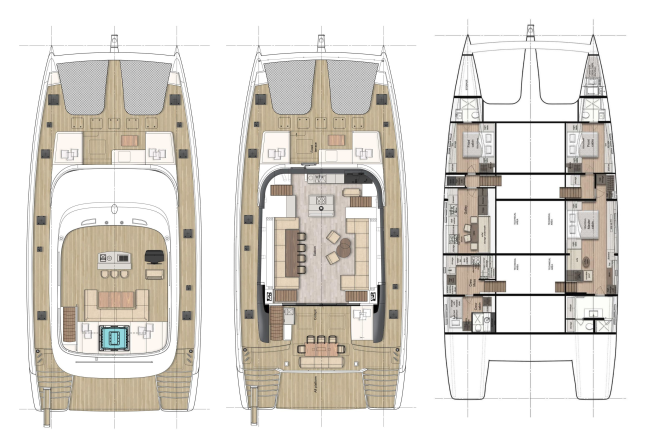 Katamarán Sunreef 80 Nala One, rok spuštění na vodu 2019 kotví v marině Split, West Coast (Zapadna obala), Splitský region (Chorvatsko), Chorvatsko. Počet kajut: 3 + 3 , může ubytovat celkem: 6 + 4 a má toalet: 3 . Povlečení a kuchyňské vybavení jsou zahrnuty v ceně.