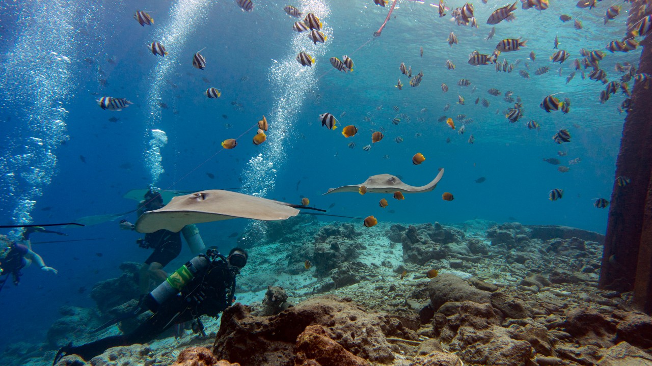 16:00 – Zkušební ponor v lokalitě Fish Tank (známé také jako „Město rejnoků“) 19:30 – Večeře