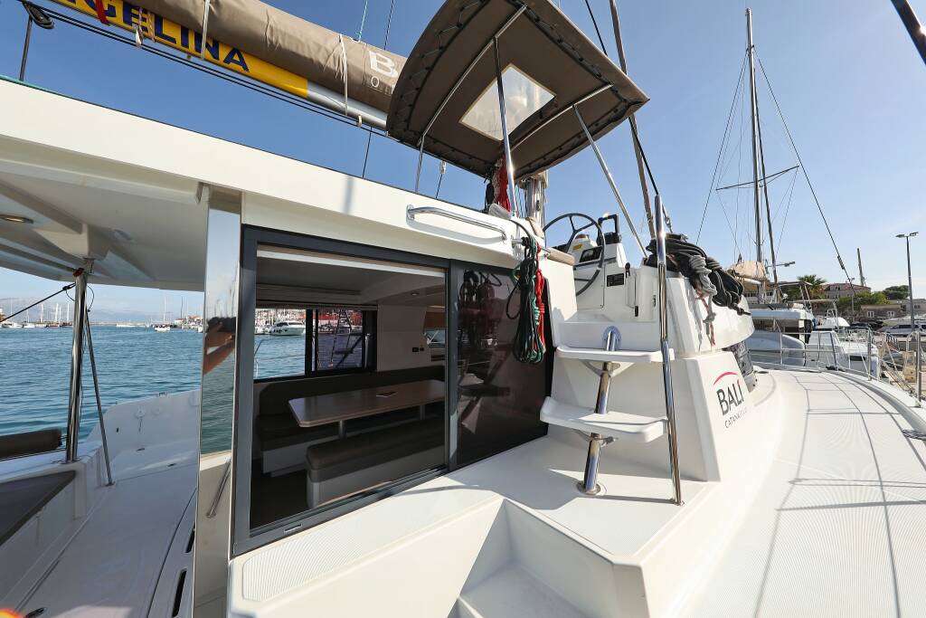 Catamaran Bali 4.1 Escape I, built in 2019 is anchored in the Trogir, Marina Trogir (ex.SCT), Split region, Croatia. It has 4 cabins, can accommodate 8 + 2 people and has 4 toilets. Bed linen and kitchen equipment are included in the price.