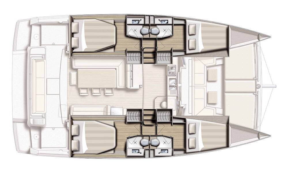 Catamaran Bali 4.1 Sinope, built in 2020 is anchored in the Preveza, Main Port, Ionian Islands, Greece. It has 4 + 2 cabins, can accommodate 8 + 1 + 2 people and has 4 toilets. Bed linen and kitchen equipment are included in the price.