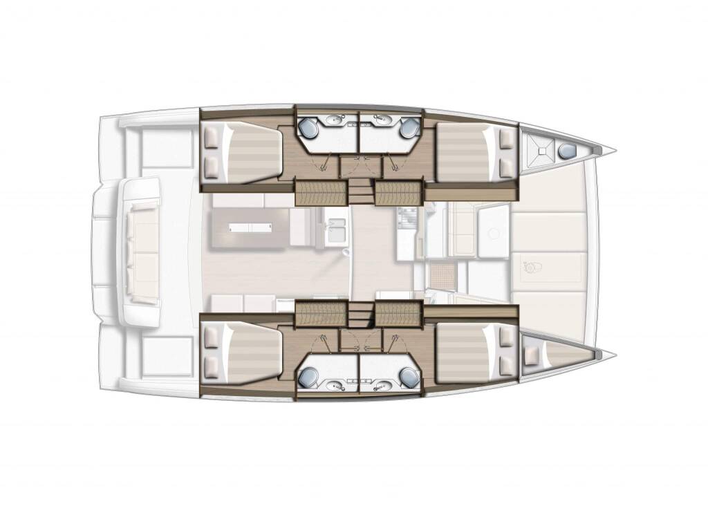 Catamaran Bali 4.2 Beta, built in 2023 is anchored in the Porto di Cecina, Tuscany, Italy. It has 4 + 1 cabins, can accommodate 8 + 1 people and has 4 + 1 toilets. Bed linen and kitchen equipment are included in the price.