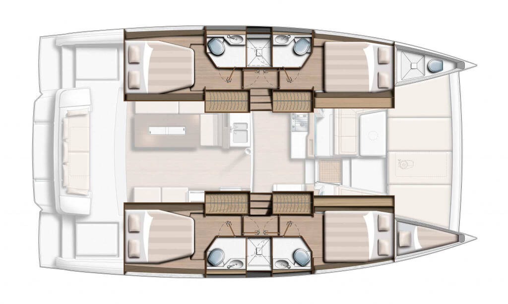 Catamaran Bali 4.2 High School, built in 2023 is anchored in the Kefalonia, Agia Pelagia Marina, Ionian Islands, Greece. It has 4 + 1 cabins, can accommodate 8 + 1 people and has 4 + 1 toilets. Bed linen and kitchen equipment are included in the price.