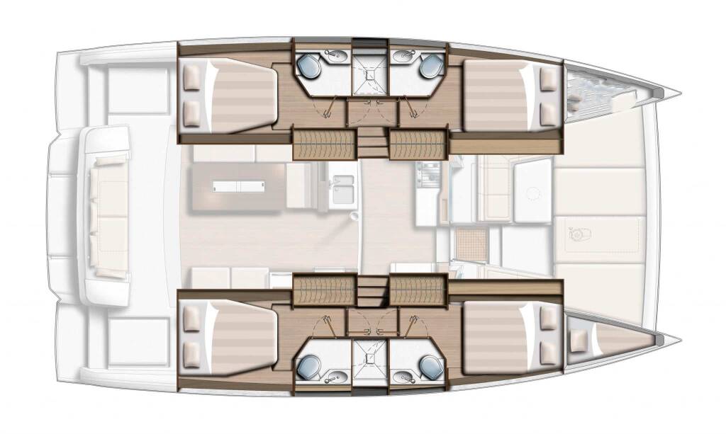 Catamaran Bali 4.2 Kamla, built in 2024 is anchored in the Marina Šangulin, Biograd, Zadar region, Croatia. It has 4 + 1 cabins, can accommodate 8 + 2 + 1 people and has 4 toilets. Bed linen and kitchen equipment are included in the price.