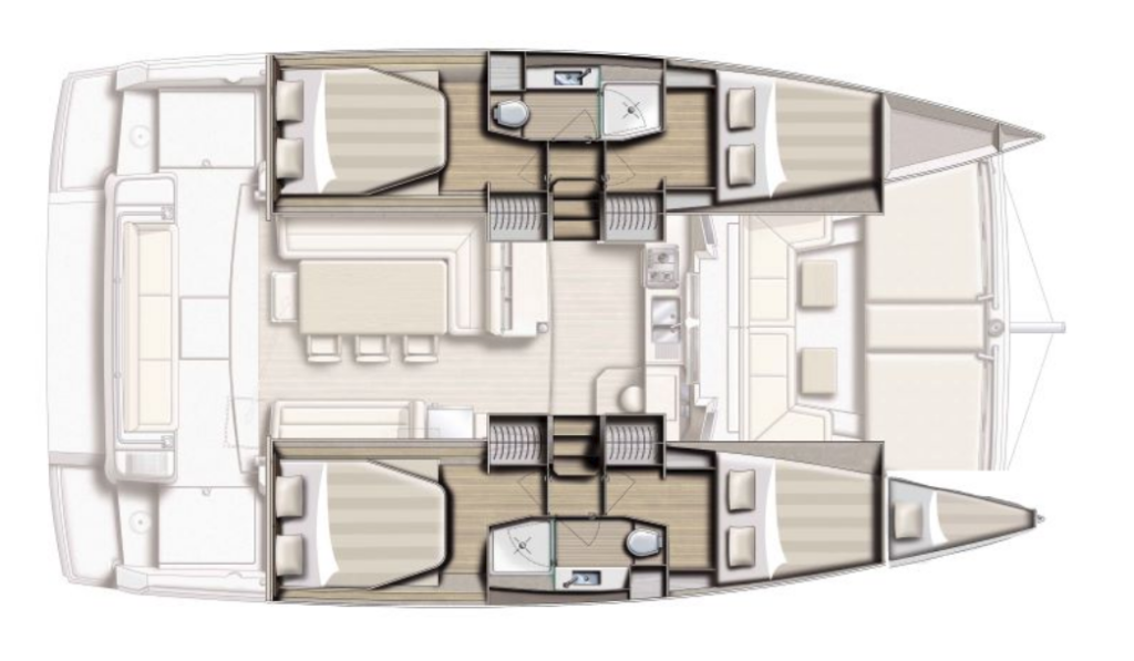 Catamaran Bali 4.2 Res23, built in 2023 is anchored in the Marina di Portisco, Sardinia, Italy. It has 4 + 1 cabins, can accommodate 8 + 1 people and has 4 + 1 toilets. Bed linen and kitchen equipment are included in the price.