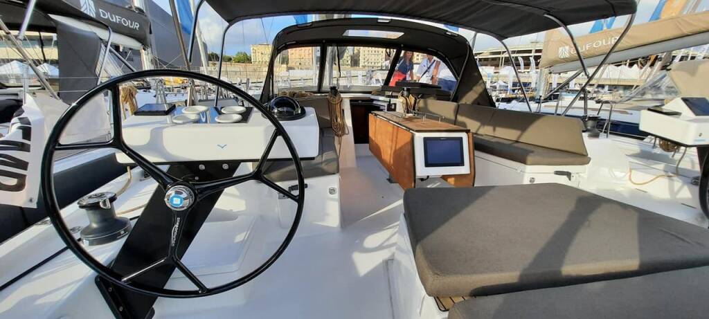Sailing yacht Dufour 470 Andromaca, built in 2025 is anchored in the Marina Cagliari, Sardinia, Italy. It has 3 cabins, can accommodate 6 people and has 2 toilets. Bed linen and kitchen equipment are included in the price.