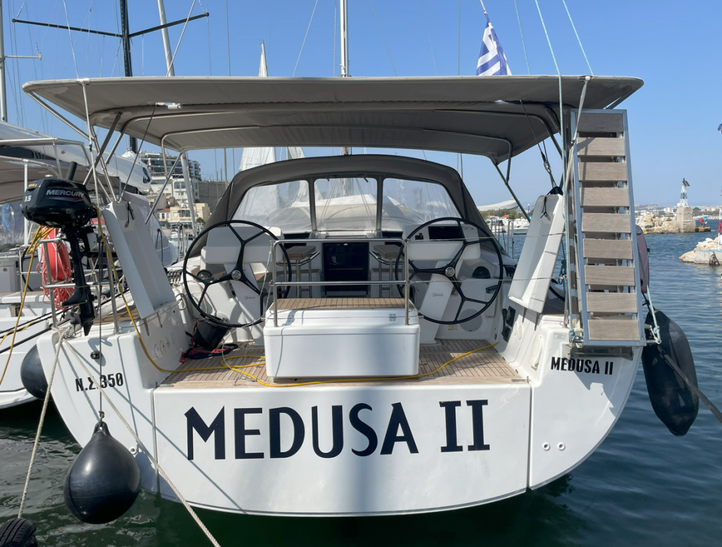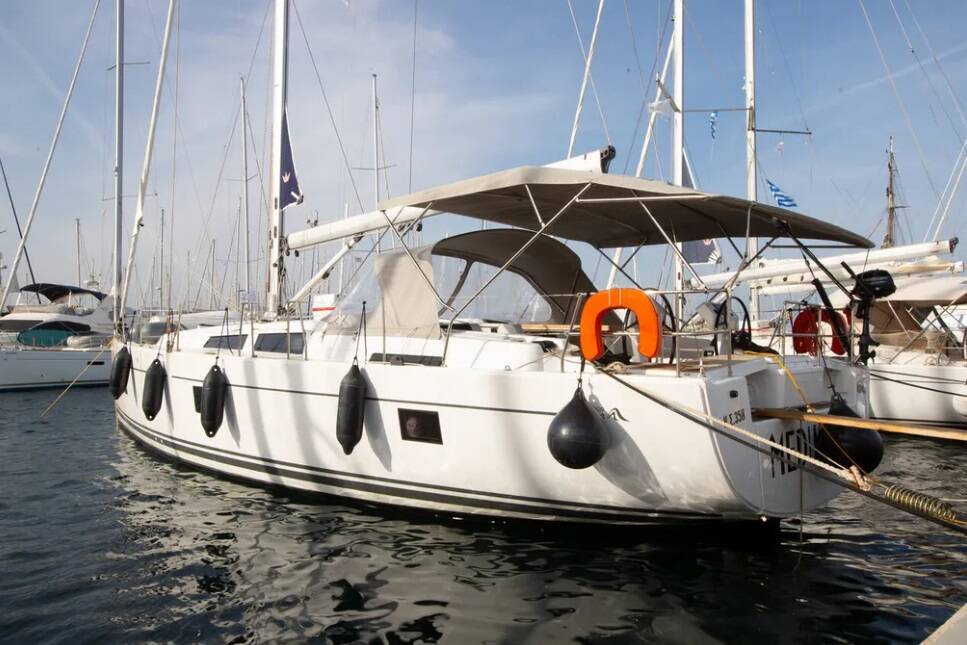 Sailing yacht Hanse 508 Medusa II, built in 2021 is anchored in the Lefkas main port, Ionian Islands, Greece. It has 5 + 1 cabins, can accommodate 10 + 1 + 1 people and has 3 + 1 toilets. Bed linen and kitchen equipment are included in the price.