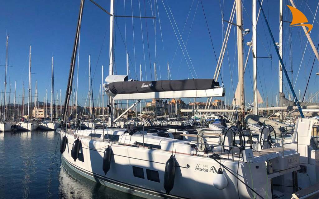 Sailing yacht Hanse 548 Janna, built in 2021 is anchored in the Hyeres Port Saint Pierre, Provence-Alpes-Côte d'Azur, France. It has 5 cabins, can accommodate 10 people and has 2 toilets. Bed linen and kitchen equipment are included in the price.