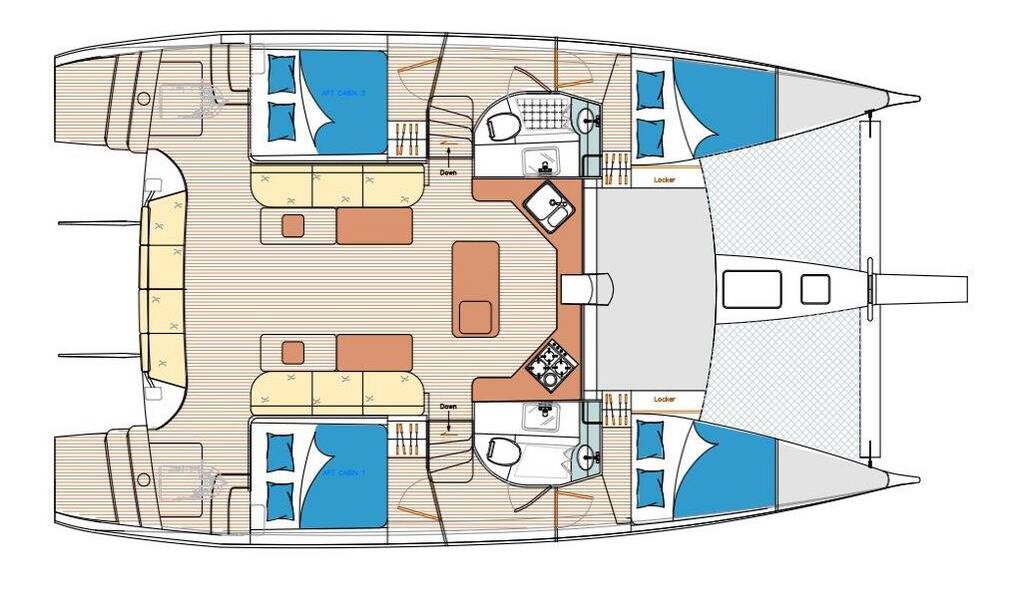 Catamaran Island Spirit 410 Kaya, built in 2022 is anchored in the Phuket, Yacht Haven Marina, Phuket, Thailand . It has 4 cabins, can accommodate 8 + 1 people and has 2 toilets. Bed linen and kitchen equipment are included in the price.