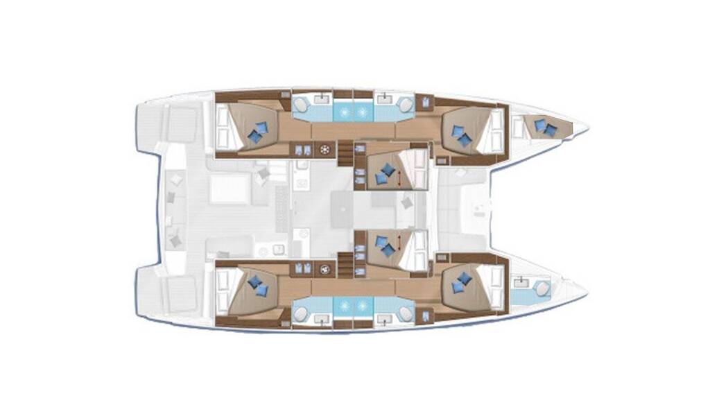 Catamaran Lagoon 50 Katka, built in 2019 is anchored in the Marina Kastela, Split region, Croatia. It has 6 + 1 cabins, can accommodate 12 + 1 people and has 4 + 1 toilets. Bed linen and kitchen equipment are included in the price.