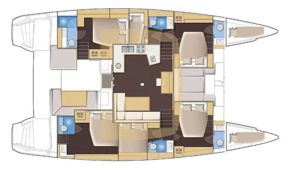 Catamaran Lagoon 52 F Akana, built in 2019 is anchored in the Trogir, Marina Trogir (ex.SCT), Split region, Croatia. It has 5 + 2 cabins, can accommodate 10 + 2 people and has 6 toilets. Bed linen and kitchen equipment are included in the price.
