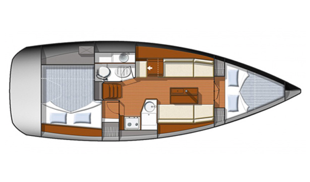 Sailing yacht Sun Odyssey 33i Britannia, built in 2014 is anchored in the Corfu, Gouvia Marina, Ionian Islands, Greece. It has 2 cabins, can accommodate 4 + 2 people and has 1 toilets. Bed linen and kitchen equipment are included in the price.