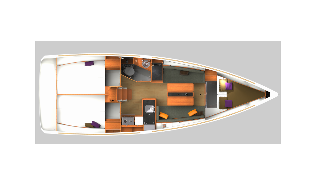 Sailing yacht Sun Odyssey 349 Siberia, built in 2015 is anchored in the Rogač (Šolta), Split region, Croatia. It has 3 cabins, can accommodate 6 + 1 people and has 1 toilets. Bed linen and kitchen equipment are included in the price.
