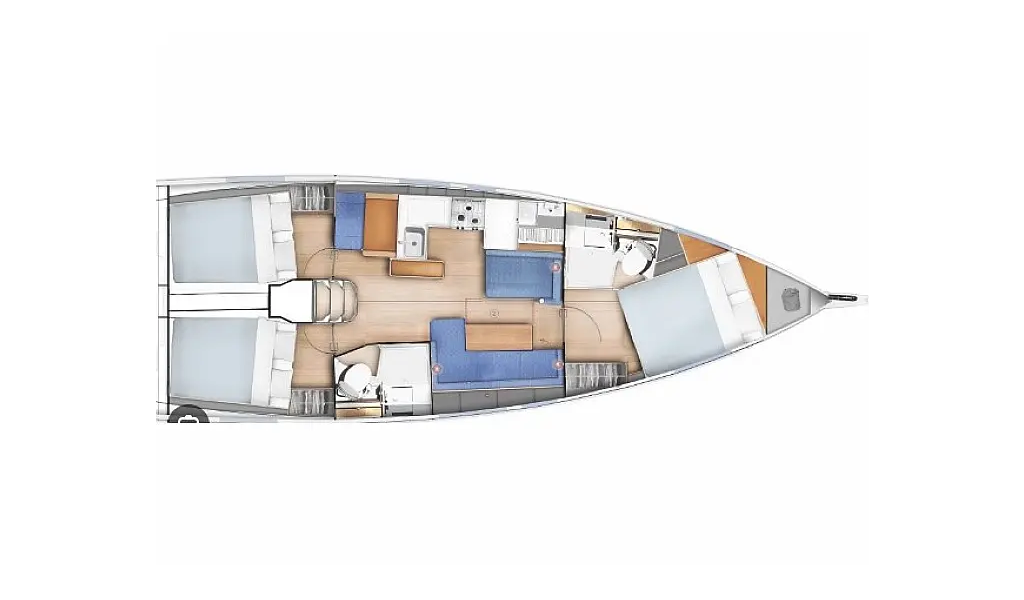 Sailing yacht Sun Odyssey 410 Garfish, built in 2021 is anchored in the Lefkas, D-Marin, Ionian Islands, Greece. It has 3 cabins, can accommodate 6 + 2 people and has 2 toilets. Bed linen and kitchen equipment are included in the price.