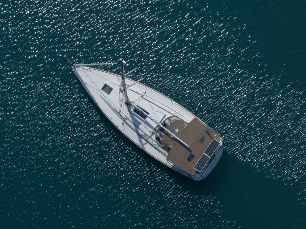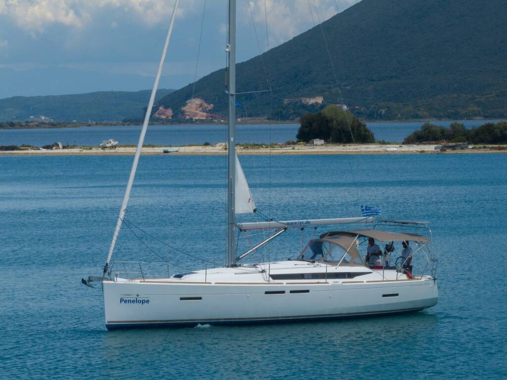 Sailing yacht Sun Odyssey 419 Penelope, built in 2016 is anchored in the Lefkas main port, Ionian Islands, Greece. It has 3 cabins, can accommodate 6 + 2 people and has 2 toilets. Bed linen and kitchen equipment are included in the price.