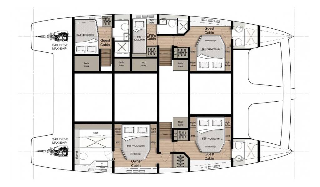 Catamaran Sunreef 50 Sweet Dreams, built in 2023 is anchored in the Marina Kastela, Split region, Croatia. It has 4 + 1 cabins, can accommodate 8 + 1 people and has 4 + 1 toilets. Bed linen and kitchen equipment are included in the price.