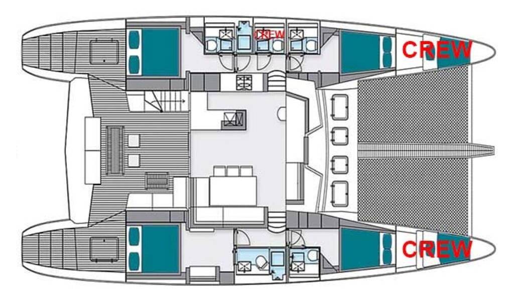 Catamaran Sunreef 62 Tekila, built in 2008 is anchored in the Ibiza, Balearic Islands, Spain. It has 4 + 2 cabins, can accommodate 8 + 2 people and has 5 toilets. Bed linen and kitchen equipment are included in the price.
