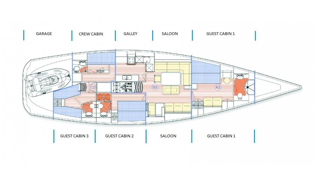Sailing yacht X-65 Eline, built in 2010 is anchored in the Trogir, Split region, Croatia. It has 3 cabins, can accommodate 6 people and has 3 toilets. Bed linen and kitchen equipment are included in the price.